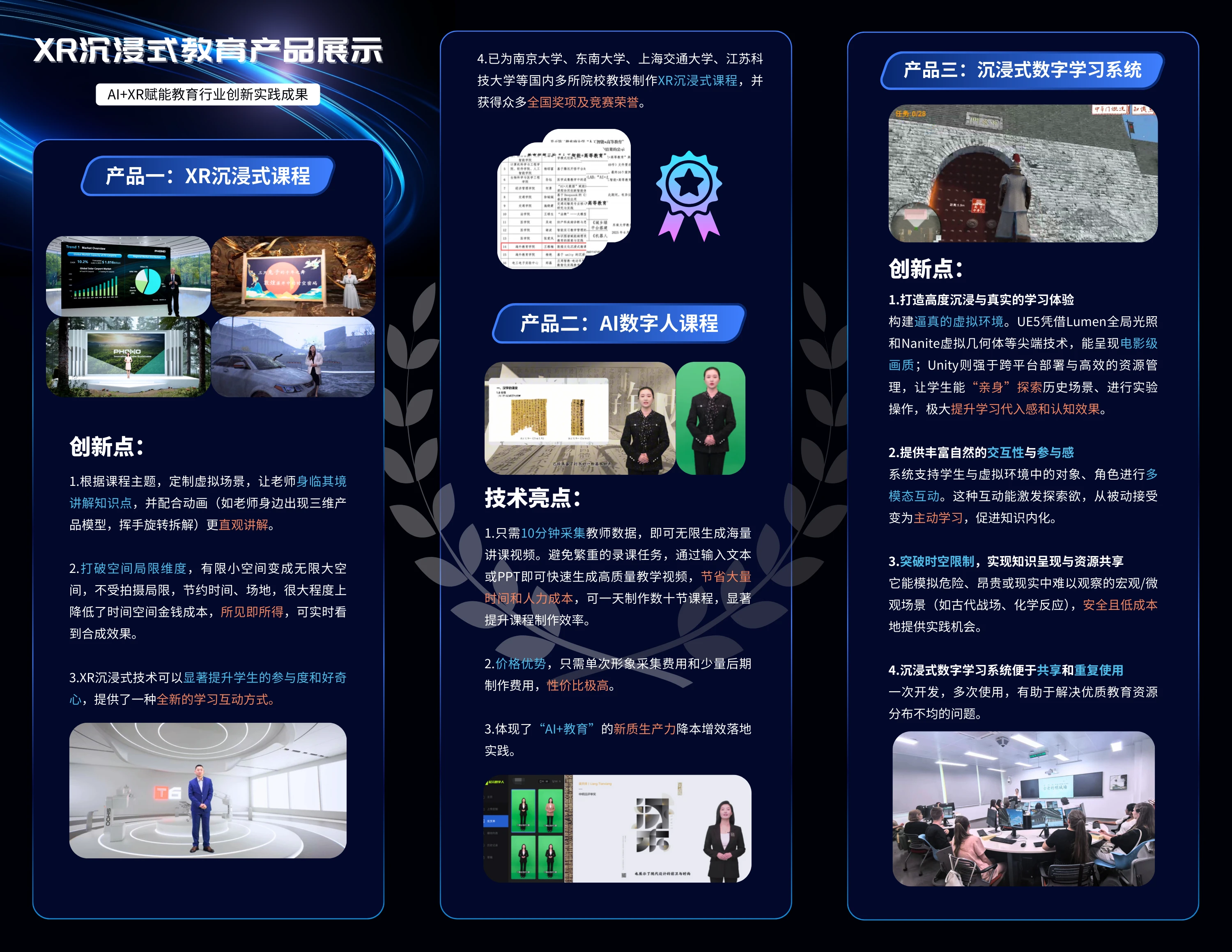 我们的创新产品与解决方案已获得业界的广泛认可,成功为南京大学、东南大学、上海交通大学、江苏科技大学等国内众多顶尖院校制作XR沉浸式课程,并在此过程中斩获了众多全国性奖项与竞赛荣誉。